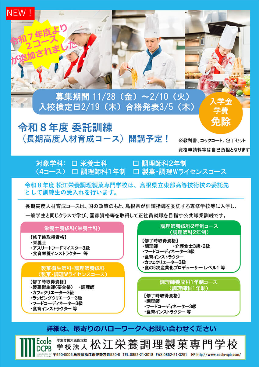 令和8年度 松江栄養調理製菓専門学校は、島根県立東部高等技術校からの委託を受け、長期高度人材育成コースの委託訓練先に選定されました。