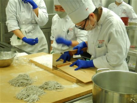 食品加工学実習の一環で『手打ちそば』を栄養士科1年生で行いました。