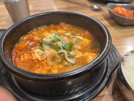 スンドゥブチゲ(辛いスープとやわらかい豆腐を煮込んだ鍋料理)も、辛さの中にも食材の旨みたっぷり!