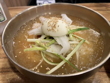 前日に食べた「南浦麺屋」の冷麺は、もちもちとした独特の食感が印象的でしたが、やはり一般的な冷麺も体験しておこうということで、ここでは麺がつるりとした食感の、いわゆる一般的な韓国冷麺をいただきました。(個人的にはこちらの冷麺の方が好みでした♡)