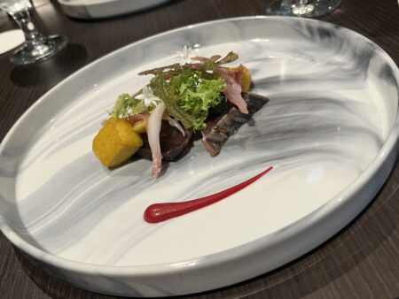 前菜はビーツのソースの酸味が鰹と相性抜群で京生麩のもちもちとした食感と