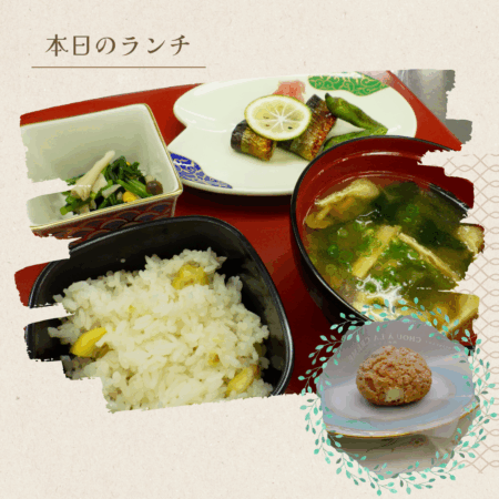 栗ご飯 / 秋刀魚の幽庵焼き / きのことほうれん草の菊花浸し / 味噌汁 / シュークリーム