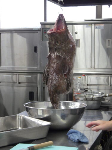 アンコウの場合は吊るしながら切った方が作業しやすいのだとか…