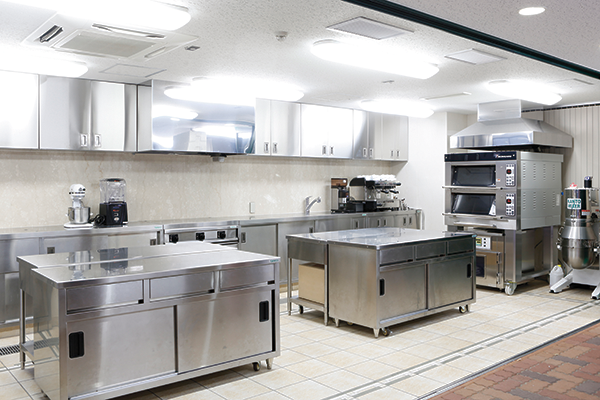 校舎1階のガラス張りのスペースは、最新のプロ仕様の機器が並ぶオープンキッチンとなっています。ここではカフェ実習も行い、生徒の皆さんが製作したパンやスイーツを直接お客様に販売したり、カフェコーナーとしてのサービスの体験をします。